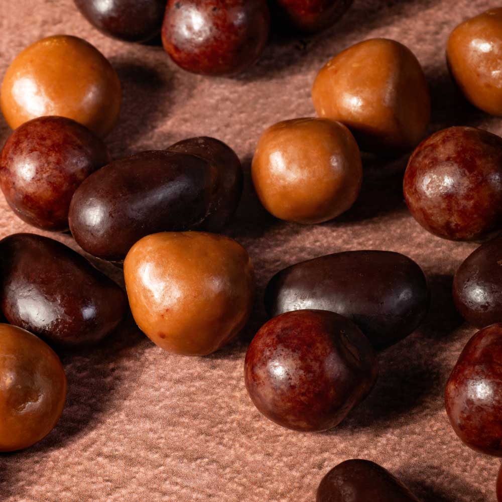 Assortiment de noisettes enrobées au chocolat au lait, amandes enrobées au chocolat noir 54% et billes de caramel enrobées de chocolat au caramel.