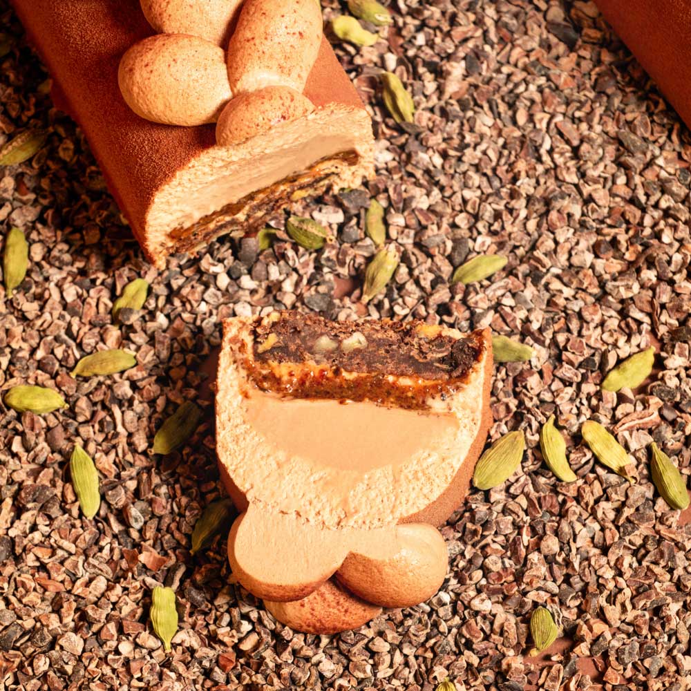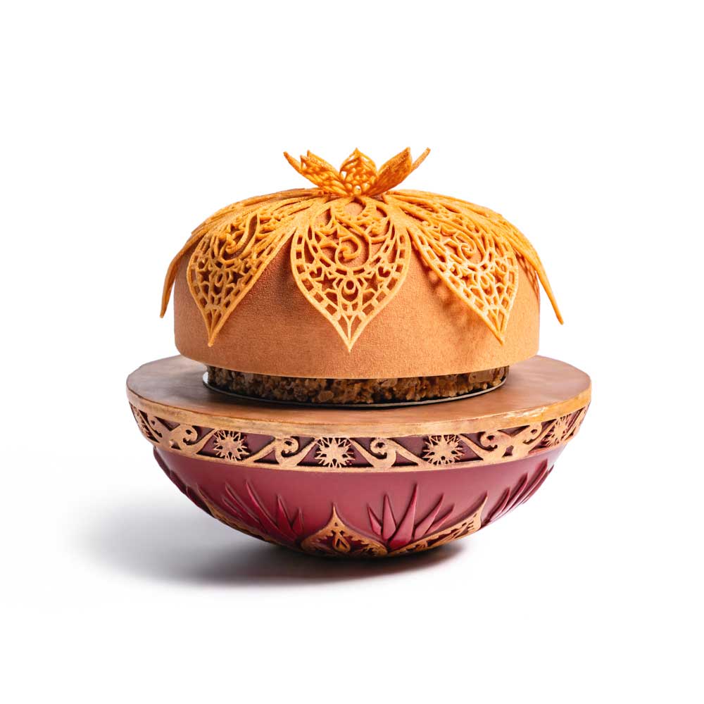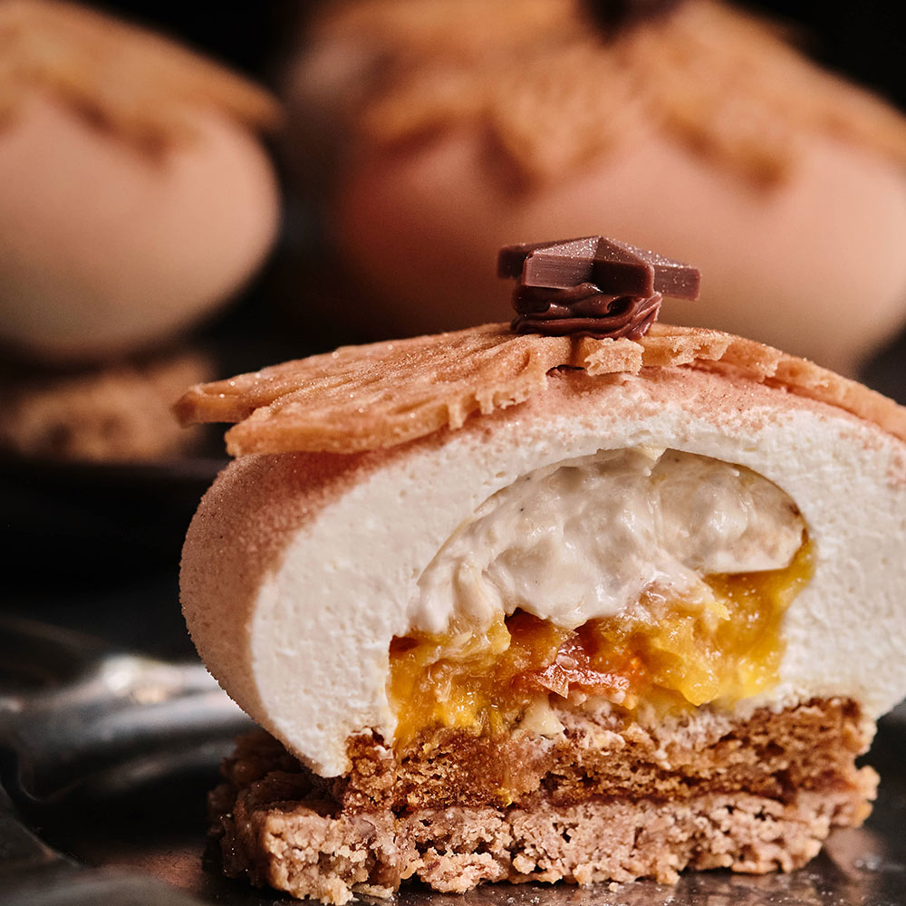 Sablé croustillant à la farine française de tradition*, sucre muscovado, chocolat d’amande blanche**, praliné, poudres de noisettes et d’amandes. Biscuit moelleux façon pain d’épices, zestes d’orange et de citron, épices de Noël, miel de fleurs, beurre AOP Charentes-Poitou. Compotée de mandarines confites et de fruits de la passion. Crémeux à l’infusion de clous de cannelier*** et vanille de Madagascar. Ganache montée au miel de châtaignier. Décor : flocage chocolat au lait ; tuile cigarette ; poudre d’or. *Moulin Viron. **Linnolat. ***Terre Exotique.