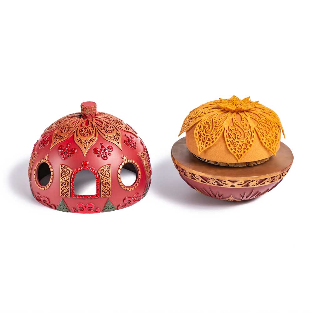 Nina invite à partager ses souvenirs d’enfance, l’odeur du sapin, le plaisir de le décorer en famille, le moment où l’on choisit le plus bel ornement, celui qui brille dans les yeux des petits comme des grands. Imaginée comme une pièce ouvragée en chocolat, un cadeau précieux posé avec délicatesse au centre de la table pour sublimer les repas de fêtes. Sous la sphère en chocolat au lait régressif et aux motifs colorés peints à la main, se trouve un entremets raffiné aux saveurs qui éveillent les sens entre notes d’agrumes, pain d’épices, miel, passion, clous de cannelier…