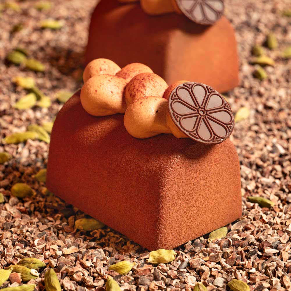 Sablé croquant au chocolat noir 70%, beurre AOP Charentes-Poitou, poudre de cacao True Gold*, crêpe dentelle, éclats de noix de pécan et fleur de sel. Brownie au chocolat noir, pépites de chocolat, éclats de noix de pécan. Crémeux chocolat noir 64% à la crème infusée aux graines de cardamome verte. Praliné pécan. Mousse légère au chocolat noir. Décor : ganache montée au chocolat ; poudre de cacao Crimson Red* et chocolat noir 70%. *DeZaan.