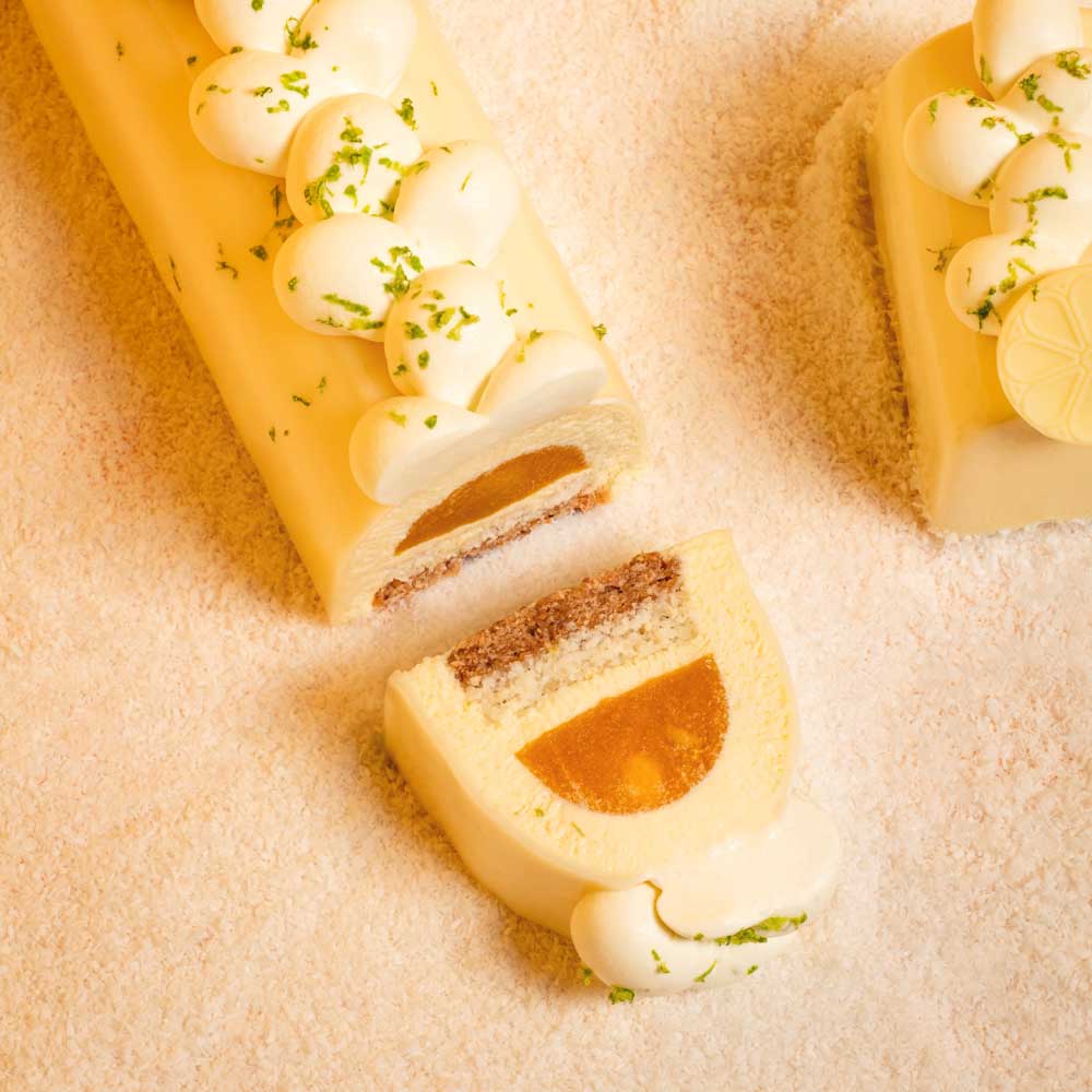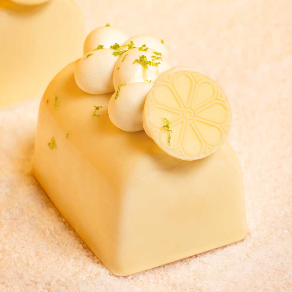 Croustillant crêpe dentelle, poudre de noix de coco, graines de millet, chocolat blanc végétal coco* et pointe de fleur de sel. Biscuit moelleux amande coco. Compotée de mangues et fruits de la passion, dés de mangue fraîche. Mousse légère coco. Décor : glaçage chocolat blanc ; ganache montée au citron vert, zestes de citron vert ; chocolat blanc. *Linnolat.