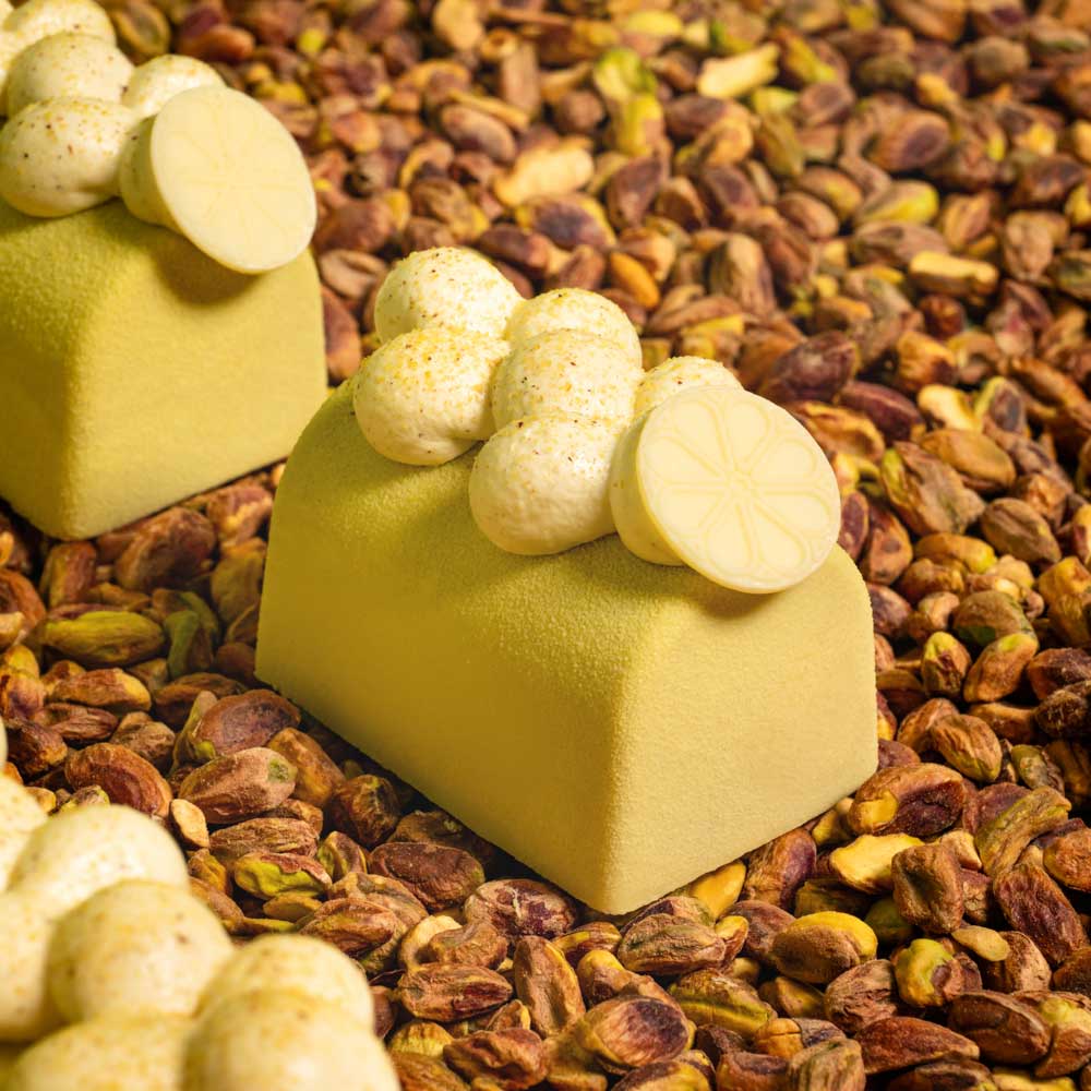 Croustillant pistache, pointe de fleur de sel de Guérande. Mousse aérienne à la pistache. Crémeux pistache. Praliné pistache. Pain de Gênes à la pistache. Décor : chantilly à la pistache ; flocage vert ; poudre de pistache ; chocolat blanc. *Pistaches d’Iran (entières, concassées, poudre) sourcées par Grégoire Bosquet.