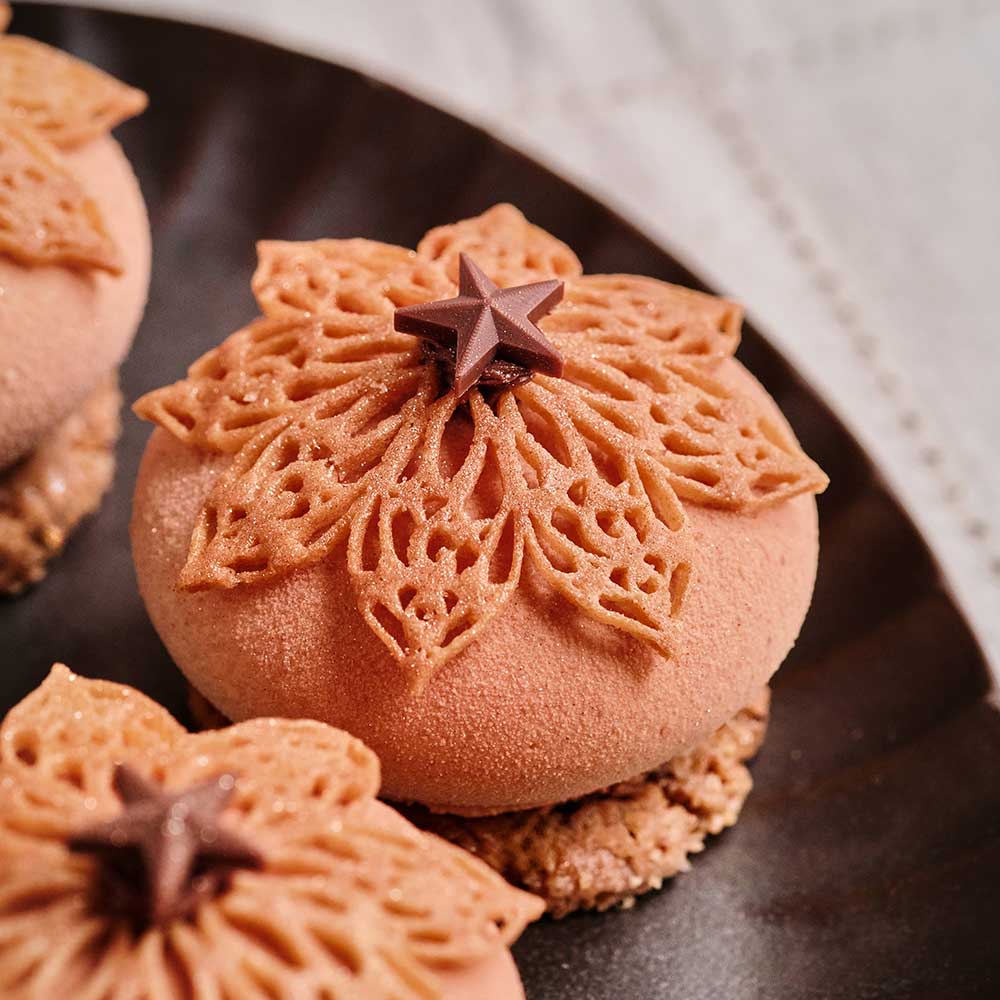 Comme une délicate miniature, la version individuelle de l’entremets qui se cache sous la coque ouvragée de Boule de Noël 2025 évoque aussi les souvenirs d’enfance de Nina et l’atmosphère des fêtes de fin d’année avec des saveurs qui éveillent les sens entre notes d’agrumes, pain d’épices, mandarine, miel, passion, clous de cannelier…