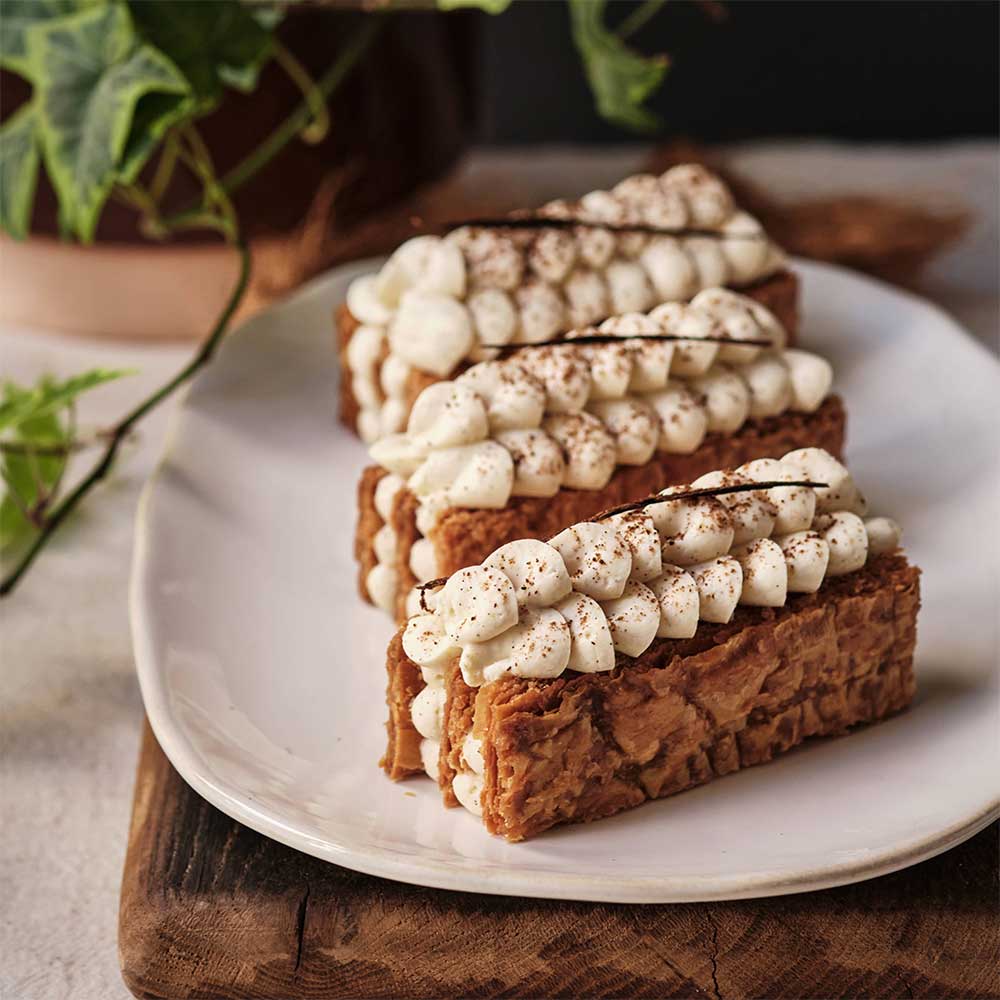 Puff pastry made with French T55 and T80 flour and small spelt from Moulin Viron and Charentes-Poitou DPO butter. Vanilla diplomat cream*. Homemade caramel with butter and fleur de sel. Vanilla Chantilly cream*. Homemade vanilla powder*. *From Madagascar.