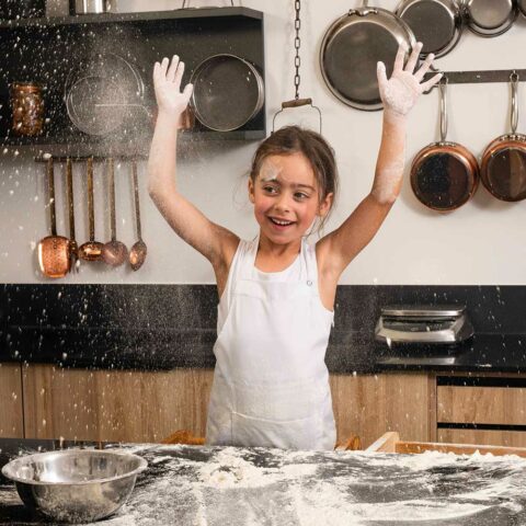Pour accompagner leurs premiers gestes, leur fierté quand elles exécutent leurs recettes, avec Lafont qui est à mes côtés depuis mes débuts en tant que cheffe, nous avons imaginé la collection capsule Mini-Me composée d’une veste mixte pour les enfants de qualité professionnelle avec son col officier « comme les grands » et de son tablier assorti.